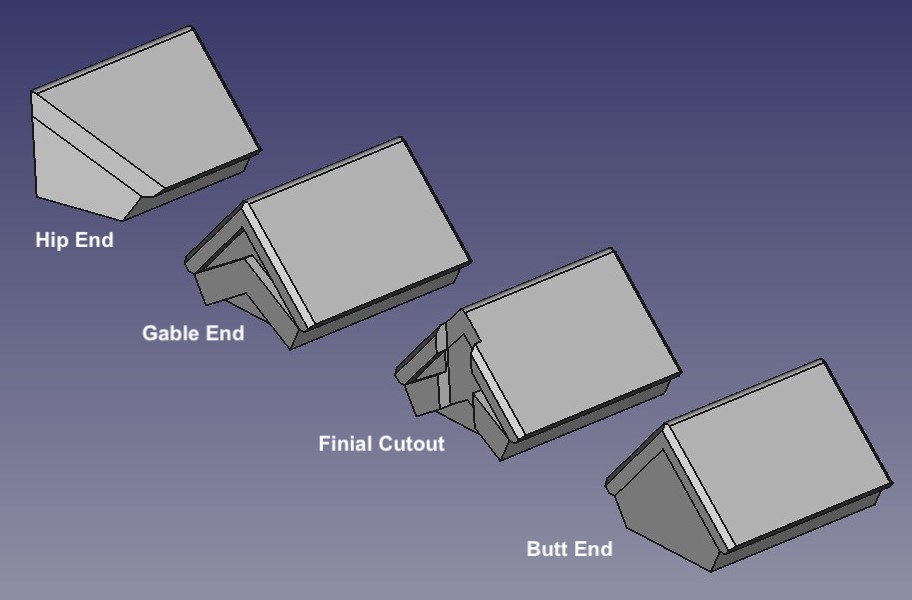 - Gable end, for use at the ends of a gable roof. This has recesses to represent continuation of the main roof material (tiles, slates, etc.) and to allow for the thickness of a bargeboard to be fitted under the end of the roof.