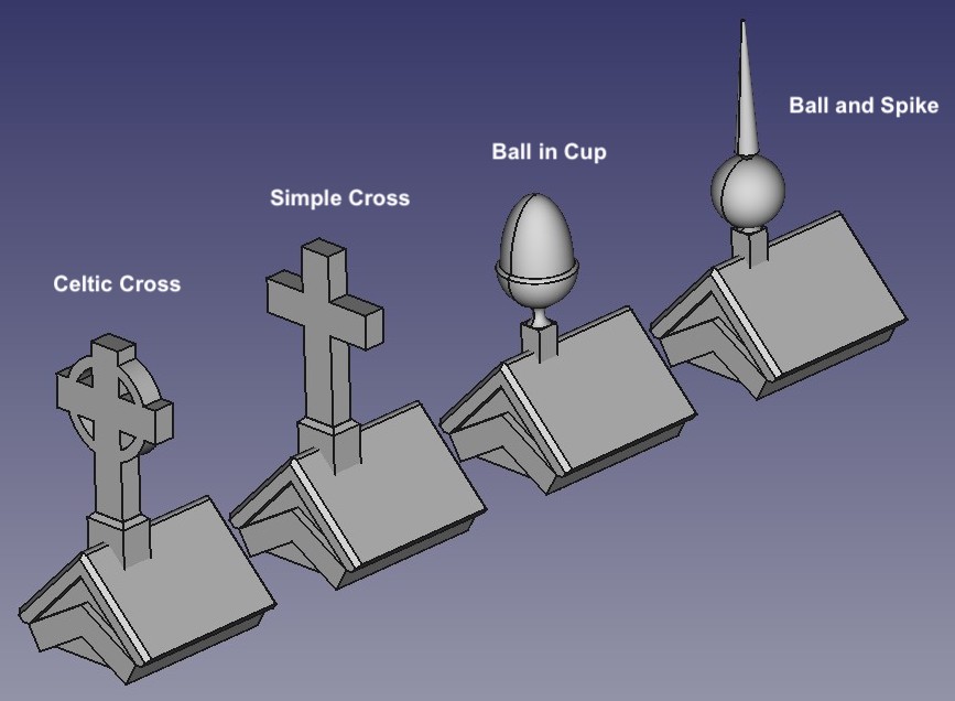 In each case, the finial is set 1/3 of the way along the end tile. If a ridge decoration is also specified, this will occupy the other half of the end tile.