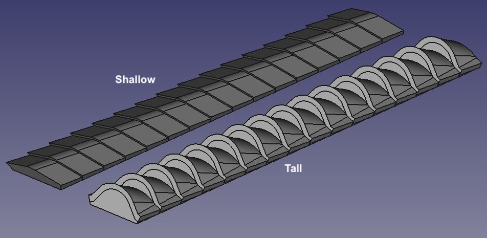 The strips have a flat base, which means that the ridges of your model roof will also need to be flattened to match, as shown in the illustration to the right. The tiles of the triangle and round types are raised above the base and have a small overhang that is intended to cover the joint between your main roof surface and the ridge strips. The raised section under the overhang is angled to match (perpendicular to) the slope of the main roof surfaces. All roof surfaces are assumed to be at the same angle to the horizontal.