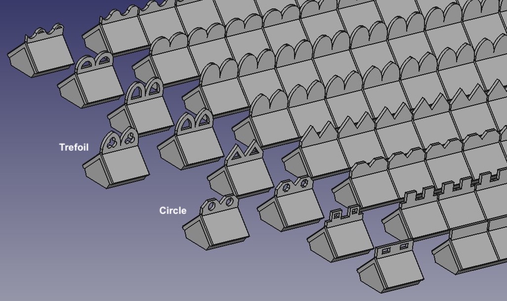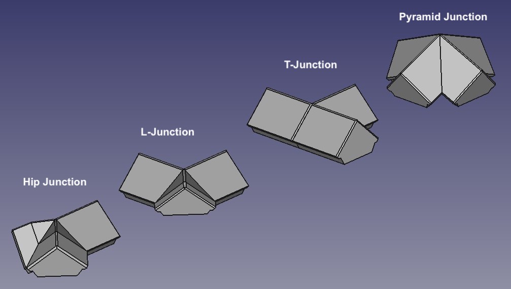 These are intended to cope with the situations where two or more roof ridges meet. They are supplied as separate components, finished with butt-ends, but ordered along with a strip as though joined to one (or both) ends. This is because some of their features descend below the base level of the main strip, making printing impossible. The junction types availabel are: