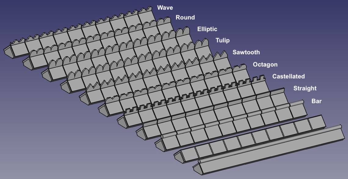 This page describes my current range of model ridge tile components, that are to be fitted to the ridges of the roof of your model building. These are 3D-printed in UV resin, and are available in a selection of styles, shapes, sizes, and in a variety of scales. The current range of basic ridge tile strip types is shown in the illustration below: