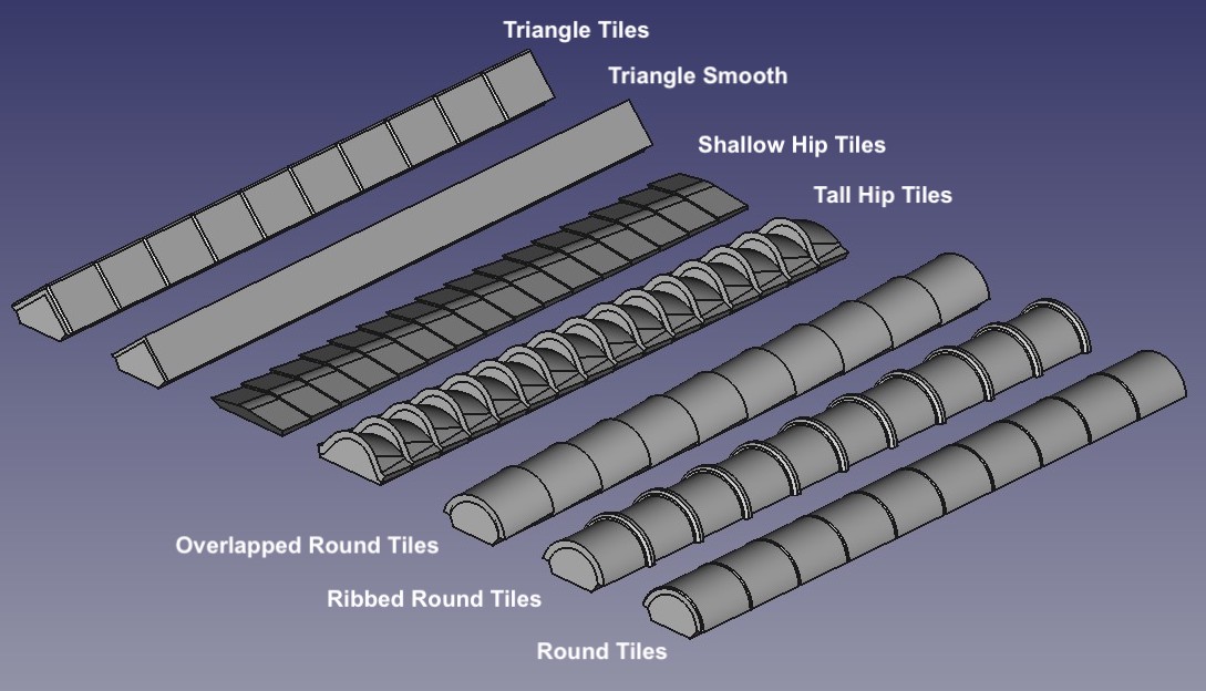 The basic strip types available represent triangular or round tiles for the main roof ridges, or special tiles for the sloping ridges of a hipped or pyramid roof. The triangle and round types can also be used on hip ridges. The strips are configurable for overall length, and tile length and height. The triangle types are also configurable for angle of slope. The strips may be configured with a representation of tiles butted end-to-end, with a ribbed joint, or overlapping (the overlapped and ribbed styles are shown for round tiles, but may also be specified for triangle tiles). The strips may also be configured without any tile representation, to model the case where the roof ridge is covered with lead flashing (or similar).