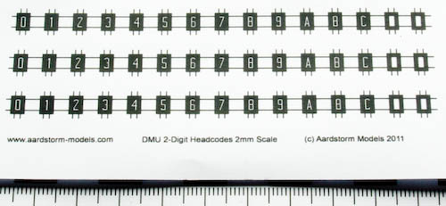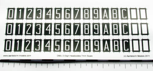 These decals were developed to fit the Tower Models brass DMU models in 7mm scale, as shown below. The decals for other scales have been rescaled from these. Each sheet contains three complete sets of numerals 0–9, letters A–C and two blank panels; sufficient for both ends of a single DMU together with a spare set. These decals can be supplied in a variety of scales, from 2mm to 16mm, and on white-backed or transparent (transparent digits on black background) waterslide decal paper, self adhesive paper, or plain paper.