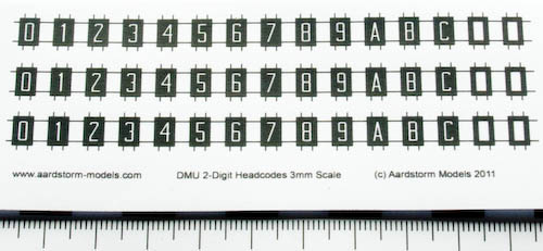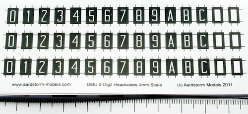 These decals are for the 2-digit headcode panels used on many early DMU units. These have a more "squared off", rectangular look compared to the more rounded 4-digit headcodes used on diesel and electric locos, and some multiple units. Decals for the latter pattern are available here.