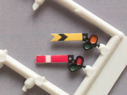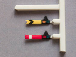 These decals are desiged to fit Ratio kits 260 and 262. Since the arms of these kits have pierced spectacle plates (to be filled with coloured varnish film, as shown to the right), these decals do not include the spectacle plates, only the coloured part of the arms. Additional cutting guide marks are also provided to allow them to be reduced to a scale 4ft from the standard 5ft arm length, as frequently used by the GWR for bracket signals. (Note that the arms provided in the kits will also have to be reduced in length by 2mm.) Each set contains decals for 36 home and 9 distant arms, and occupies 1/3 of a sheet of A5 paper.