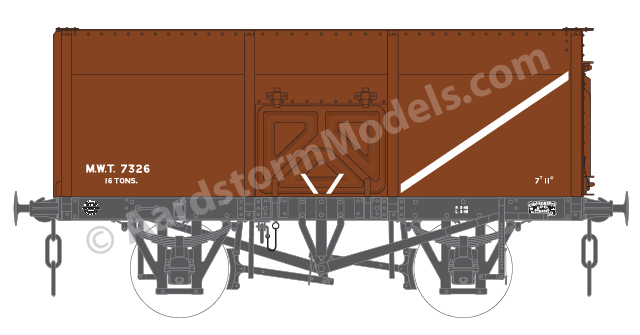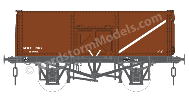 From 1944 the MWT began ordering wagons in large numbers and retained ownership of them. They were still registered as private owner wagons with the 4 grouping era railway companies. The majority of these wagons were of the Charles Roberts design, and were built by various manufacturers, as well as Charles Roberts themselves. A batch of nearly 900 wagons was also built by Hurst Nelson to a modified version of their own design – the additional intermediate side stanchions were dropped and the wagons were fitted with pressed steel side doors of the same design as the Charles Roberts wagons, having previously possibly been of fabricated construction. The MWT wagons were finished in a standard livery of bauxite, reputedly the same shade then currently being used by the LMS.